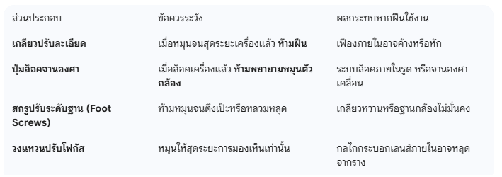 - การจัดเก็บ : เมื่อใช้งานเสร็จหรือต้องเคลื่อนย้ายในระยะไกล ควรปลดล็อคเกลียวทุกตัวให้เป็นอิสระ ก่อนบรรจุลงในกล่องเก็บให้ตรงตามตำแหน่งที่กำหนด