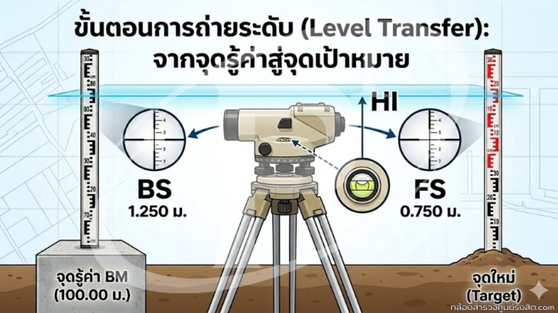 - ปิดวงรอบ (Closing Loop) : เมื่อถ่ายระดับไปถึงจุดหมายแล้ว ควรทำวิธีเดิมย้อนกลับมาที่จุดเริ่มต้น เพื่อเช็คว่าค่าที่ได้คลาดเคลื่อน (Error) เกินมาตรฐานหรือไม่