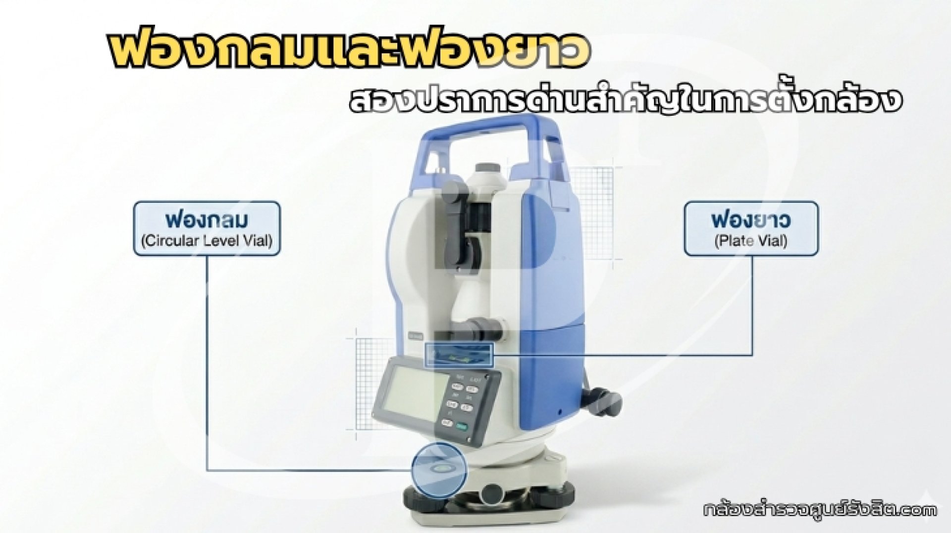 - การใช้งาน : ปรับโดยใช้ สกรูปรับระดับ (Leveling Screws) 3 ตัวที่ฐานกล้อง โดยต้องปรับ 2 ทิศทางที่ตั้งฉากกันเพื่อให้ลูกน้ำอยู่ตรงกลางในทุกตำแหน่งที่หมุนกล้องไป