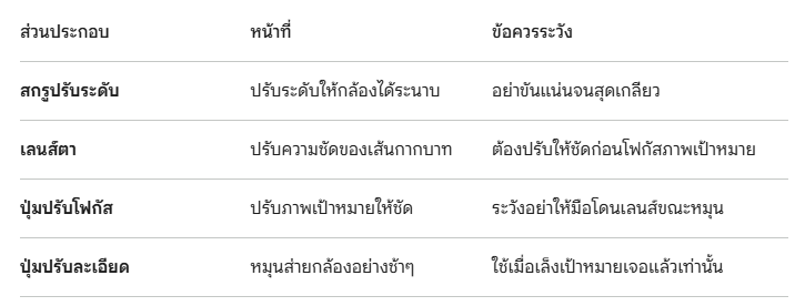 - เลนส์ตา (Eyepiece) : อยู่ด้านหลังสุดที่คุณต้องส่องตาเข้าไป เคล็ดลับคือ ต้องหมุนปรับเลนส์ตาก่อนเพื่อให้เห็น "เส้นใยสายตา" (Crosshair) สีดำเข้มชัดเจนที่สุด