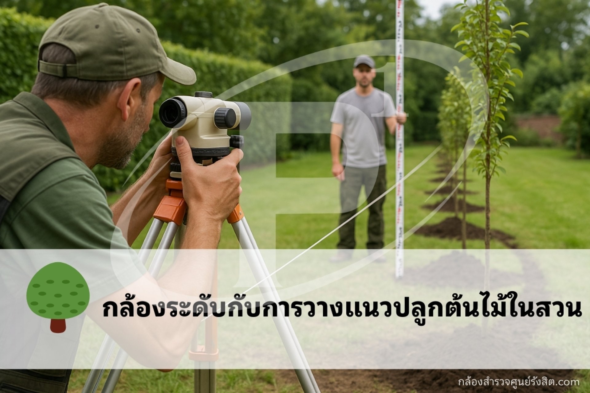 กล้องระดับกับการวางแนวปลูกต้นไม้ในสวน