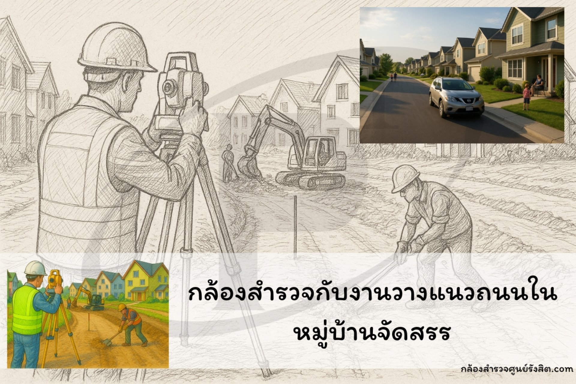 การใช้ กล้องสำรวจในงานวางแนวถนนภายในหมู่บ้านจัดสรร เป็นหนึ่งในขั้นตอนสำคัญของงานก่อสร้างระบบสาธารณูปโภคเบื้องต้น ซึ่งต้องอาศัยความแม่นยำทั้งในด้านแนว (แนวราบ) และระดับ (แนวดิ่ง) เพื่อให้ถนน ตรง, ระบายน้ำได้ดี, และอยู่ในตำแหน่งที่สอดคล้องกับผังโครงการ