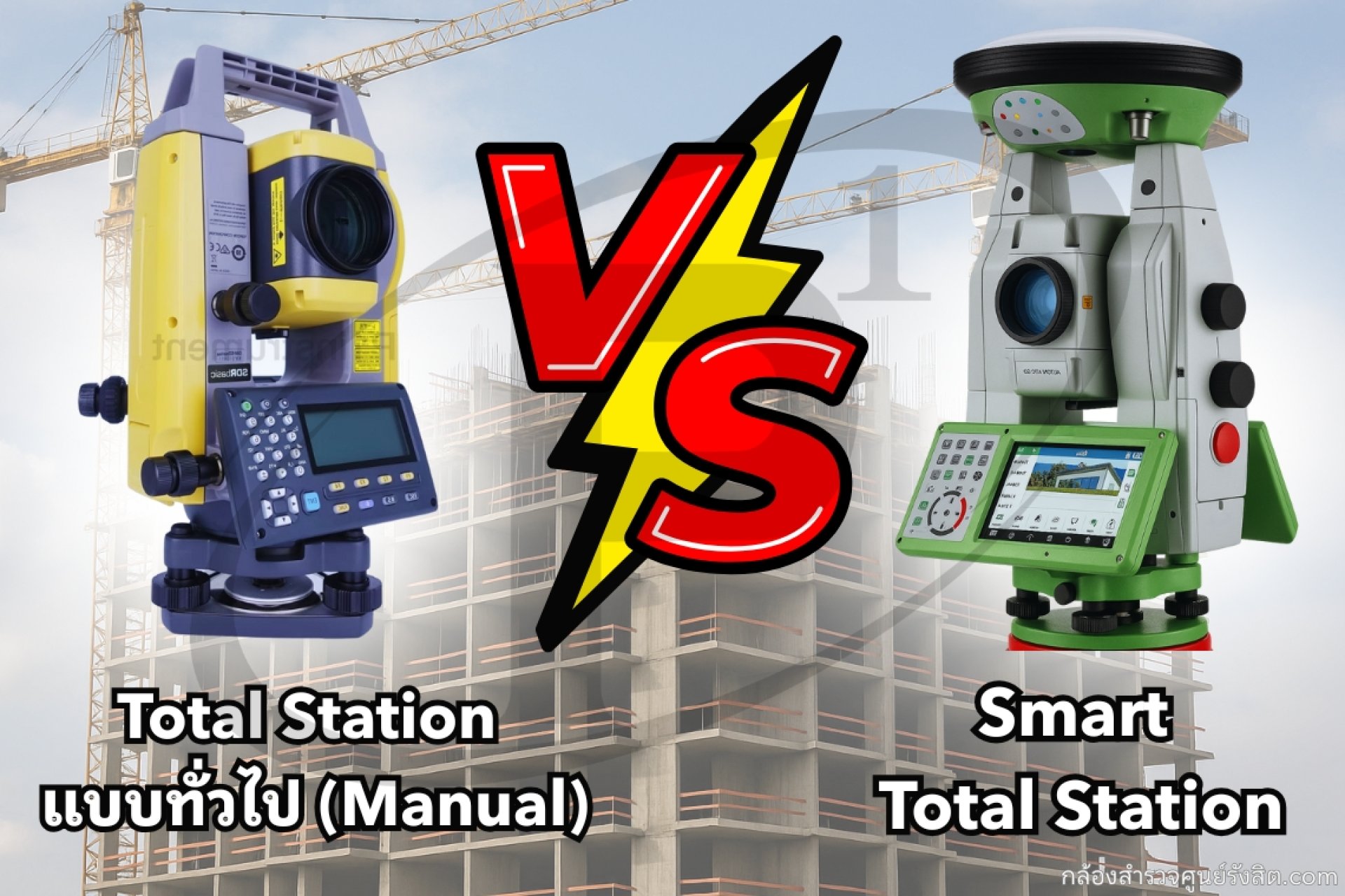 เปรียบเทียบระหว่างกล้อง Total Station แบบทั่วไป (Manual) กับ กล้อง Total Station แบบสมาร์ท (Smart Total Station) ในหลายด้านสำคัญ เพื่อช่วยให้ตัดสินใจเลือกใช้งานได้อย่างเหมาะสมกับความต้องการ