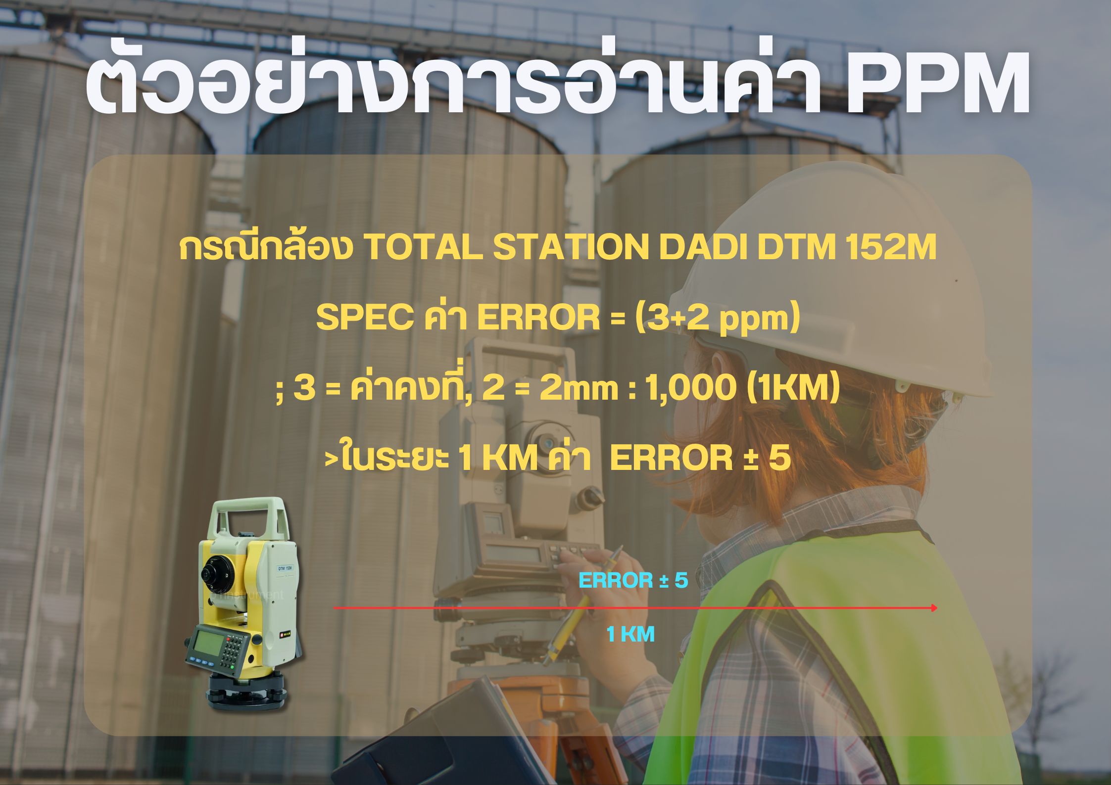 กรณีที่ค่าของตัวกล้อง Total Station ของเราอยู่ที่ ± 3 PPM หมายความว่า ในระยะ 1 กิโลเมตร ค่า ERROR ที่เกิดขึ้นจะอยู่ที่ ± 3 มิลลิเมตร
