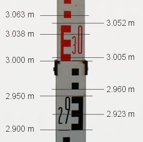 - บริเวณช่วง 50 มม. สุดท้ายของทุกๆ 100 มม. มักมีแถบหรือกรอบเป็นรูปตัวอักษร “E” ช่วยให้สังเกตระดับได้ง่ายเมื่อต้องอ่านค่าจากระยะไกลผ่านกล้อง