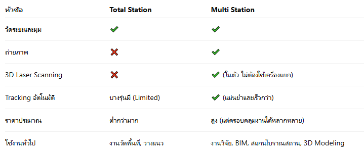 หากต้องการแค่งานสำรวจทั่วไปหรือวางแนว งานสร้าง – Total Station ก็เพียงพอ แต่หากต้องการสแกน 3 มิติ, ทำงานรวดเร็ว, เชื่อมโยงกับ BIM หรือทำงานที่ต้องการความแม่นยำระดับสูง ควรเลือก – Multi Station
