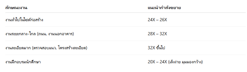 การเลือกกำลังขยายของกล้องระดับสำคัญ เพราะช่วยให้เล็งเป้าชัดขึ้น, อ่านค่าง่ายขึ้น, ได้ค่าระดับแม่นยำขึ้นเหมาะกับงานภาคสนามที่ต้องวัดหลายจุด และต้องใช้ข้อมูลไปวางโครงสร้างหรือควบคุมระดับต่าง ๆ