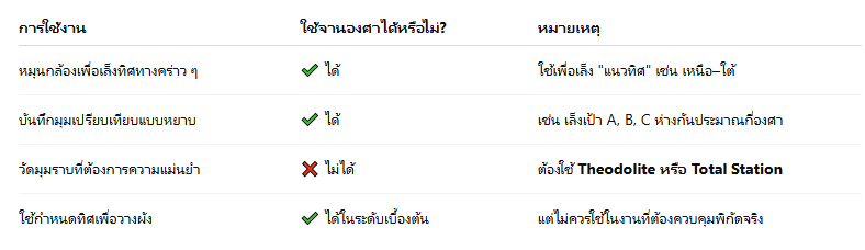 การใช้เข็มทิศร่วมกับกล้องสำรวจนั้น มีประโยชน์ในขั้นตอนเตรียมงาน, ตรวจสอบทิศเบื้องต้น, และสำรวจในพื้นที่ไม่มีข้อมูล แต่สำหรับงานที่ต้องการความแม่นยำสูง → ควรใช้กล้องวัดมุม หรือ Total Station เป็นหลัก