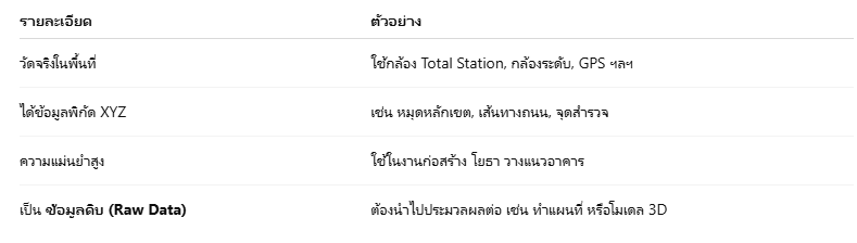 งานสำรวจ คือ กระบวนการเก็บข้อมูลเกี่ยวกับตำแหน่ง พิกัด ระดับ และลักษณะของพื้นที่จริง ด้วยการวัดระยะ มุม และความสูง เพื่อใช้เป็นพื้นฐานในการออกแบบ ก่อสร้าง หรือทำแผนที่