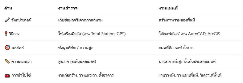 งานสำรวจกับงานแผนที่มีความเกี่ยวข้องกันอย่างใกล้ชิด แต่มีความแตกต่างกันอย่างชัดเจนในด้าน วัตถุประสงค์ กระบวนการ และผลลัพธ์ ดังนี้