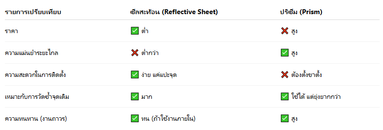 ใช้ ซีลสะท้อน เพราะ สะดวก ประหยัด ใช้งานซ้ำได้ เหมาะกับจุดวัดถาวรในพื้นที่เข้าถึงยาก แต่ถ้าเน้นความแม่นยำสูงในระยะไกล หรือวัดในพื้นที่โล่ง — ควรใช้ปริซึม