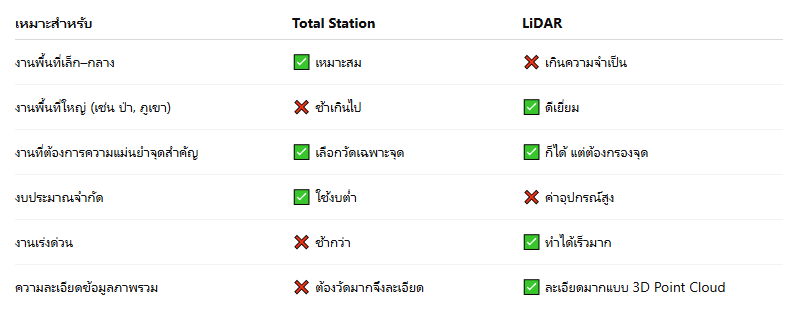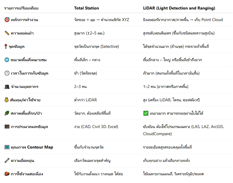 การทำ แผนที่เส้นชั้นความสูง (Contour Map) สามารถทำได้ทั้งโดยใช้ Total Station และ LiDAR โดยแต่ละวิธีมีข้อดี-ข้อจำกัดต่างกัน ขึ้นอยู่กับลักษณะของพื้นที่, ขนาดพื้นที่, ความแม่นยำที่ต้องการ, เวลา และงบประมาณ