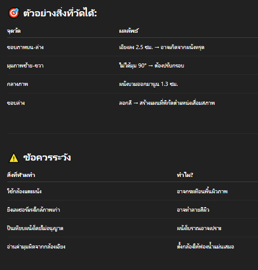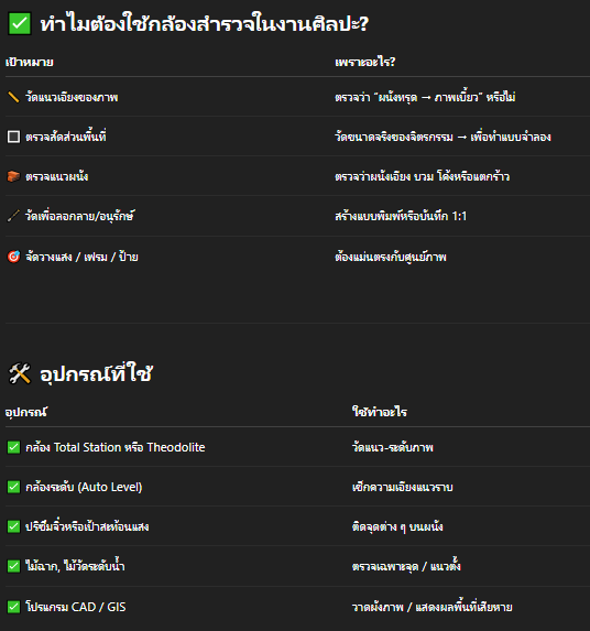 การใช้กล้องสำรวจในงานศิลปะช่วยให้วัดสภาพโครงสร้าง อย่างไม่สัมผัสผนัง วัดได้ทั้ง “แนว-ระดับ-เอียง-ความโค้ง” เพื่อเป็นข้อมูลสำคัญในการอนุรักษ์หรือซ่อมแซม