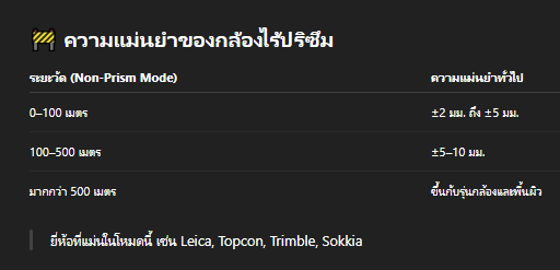 คือกล้อง Total Station ที่สามารถ วัดระยะโดยไม่ต้องใช้เป้าปริซึมใช้ “ลำแสงเลเซอร์” หรือ “อินฟราเรด” ยิงไปยังวัตถุ ที่สะท้อนแสงได้เอง เช่น ปูน ผนัง หิน โลหะ เหมาะกับจุดที่ “เข้าไปไม่ได้” เช่น ขอบเขื่อน ผนังพัง สะพานแตกร้าว