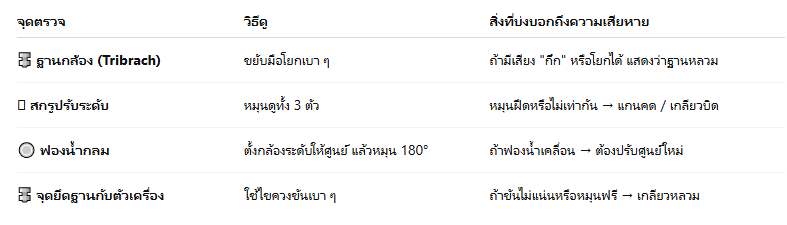 ถ้ามีอาการโยกแม้เพียงเล็กน้อย ส่งสอบเทียบ (Calibration) ทันที ห้ามใช้งานต่อในงานก่อสร้างหรือตั้งแนวโครงสร้าง เพราะค่าพิกัดจะคลาด